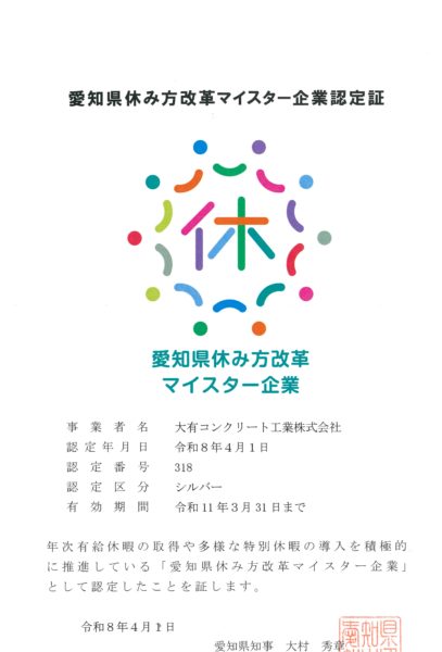 この度、愛知県より「愛知県休み方改革マイスター企業」として更新認定していただきました。