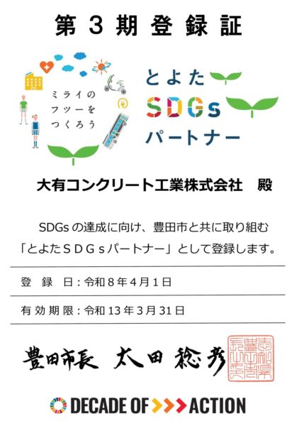この度、豊田市が募集している、SDGs(持続可能な開発目標)の達成、持続可能なまちの実現に向けて、豊田市と共に取組等を実施、協力する企業・団体等「とよたSDGsパートナー」に改めて応募し、更新登録をいただきました。